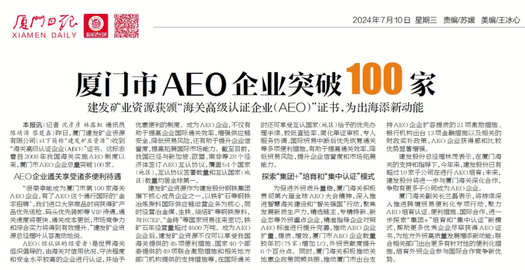 交融共贏(yíng)開(kāi)新局丨建發(fā)礦業(yè)資源獲頒成為廈門(mén)市第100家AEO高級(jí)認(rèn)證企業(yè)